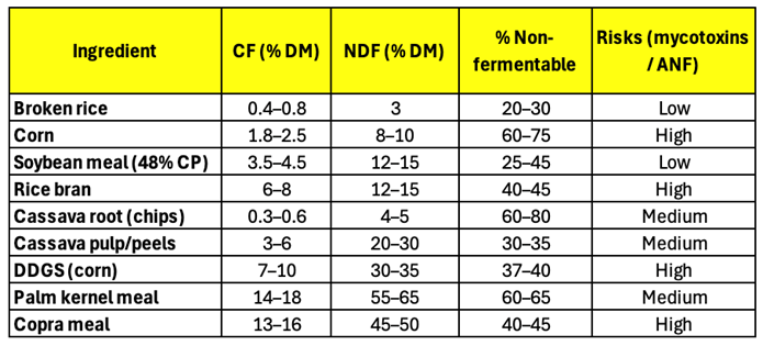 Reaching these fiber targets with standard ingredients is challenging. The table below is illustrating the fiber content of main ingredients used in Asia with their portion of non-fermentable fiber. These values represent average ranges frequently reported in publications and feed tables for Asian ingredients; however, fibre composition varies widely with origin, processing and storage, and should always be confirmed by laboratory analysis of specific raw material batches before use in formulation. Nutrispices offers analytical services if you would like to learn more about the fibre profile of your ingredients. Do not hesitate to contact me and send you your samples for analysis.
