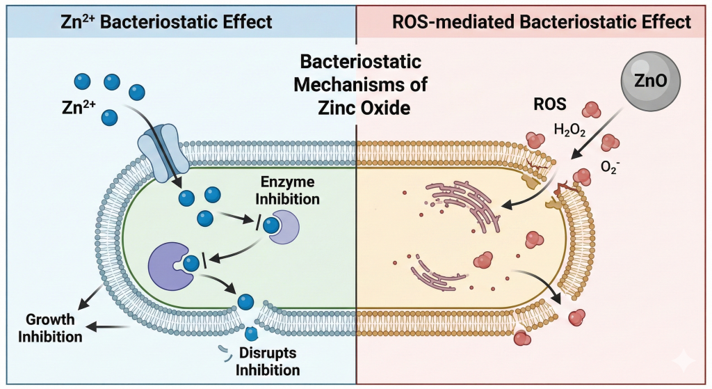 In addition to Zn²⁺ release, zinc oxide exhibits a surface-mediated antibacterial activity through the generation of reactive oxygen species (ROS). In contact with water and oxygen, Zinc oxide is capable of producing reactive oxygen species such as superoxide radicals (O₂•⁻). This phenomenon is enhanced under acidic conditions, which explains why it is most active in the stomach and less effective in the intestine. These ROS are extremely short-lived and act only within a few nanometers from the zinc oxide particle. Their antibacterial action is strictly local and contact-dependent. ROS disrupt bacterial cell membranes, increasing membrane permeability and facilitating the penetration of Zn²⁺ ions into bacterial cells. The antibacterial efficacy of zinc oxide therefore results from a synergistic action between reactive oxygen species and Zn²⁺ ions generated at the particle surface, a mechanism that cannot be reproduced by soluble zinc sources.