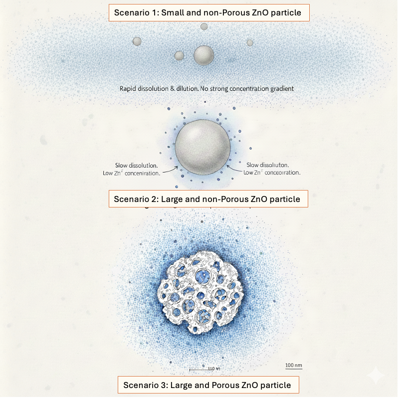 Scenario 3 = Porous Zinc Oxide combining large particle size with high surface area, is designed to maximize persistence and reactivity along the digestive tract. This physical structure is optimal for creating high local concentration gradients of Zn²⁺ around the zinc oxide crystals, generating a microenvironment that is highly unfavorable for bacterial survival.