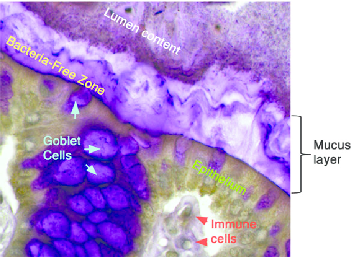 The intestinal tract of monogastric animals is a living interface constantly renewing and protecting itself. Along its wall, specialized goblet cells secrete mucus that forms a thin protective film over the epithelium. This mucus layer lubricates the passage of digesta, shields the intestinal cells from mechanical friction and pathogens, and provides a habitat for beneficial bacteria. It acts as the gut’s first line of defense while allowing nutrients to diffuse through to the absorptive cells.