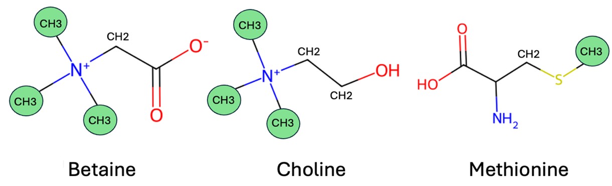Methionine – this is the most important contributor to the process. Methionine is an amino-acid that carries one methyl group. It is primarily acting as a building block of protein but it is essential a major methyl donor. However, methionine is also one of the most expensive amino acids in feed formulations.