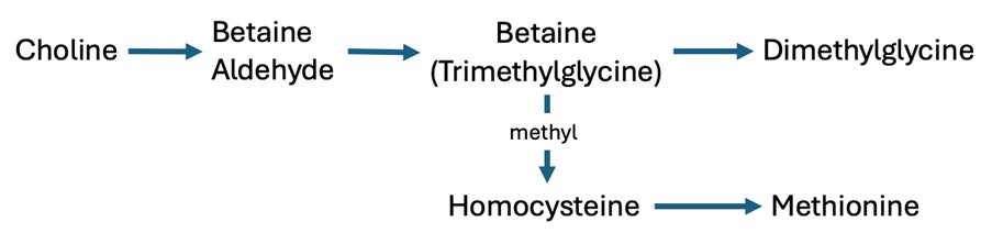 Betaine is more effective than choline as a methyl donor because it acts directly and immediately. While choline must first be converted in the liver through multiple steps to become betaine, betaine itself can donate a methyl group right away to support the remethylation of homocysteine into methionine. This direct action is not only faster but also more efficient, as it bypasses the need for additional enzymes, energy, and co-factors like folate or vitamin B12. In situations of metabolic stress, where these pathways may be impaired, betaine remains reliably active, making it a more effective tool for supporting methylation in animal nutrition.