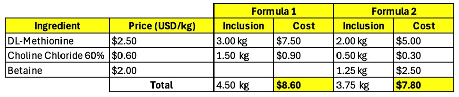 In the illustration below, we took a standard broiler diet containing 3kg of DL-Methionine and 1.5kg of Choline Chloride 60% per ton of feed and we made a partial replacement by the inclusion of some betaine resulting in a savings of 0.80 USD per ton of feed.