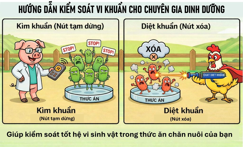 Thứ nhất, hiệu quả kìm khuẩn phụ thuộc vào thời gian tiếp xúc, trong khi hiệu quả diệt khuẩn phụ thuộc vào liều lượng. Nhầm lẫn giữa hai yếu tố này dẫn đến kết quả ứng dụng thực tế chăn nuôi không nhất quán.